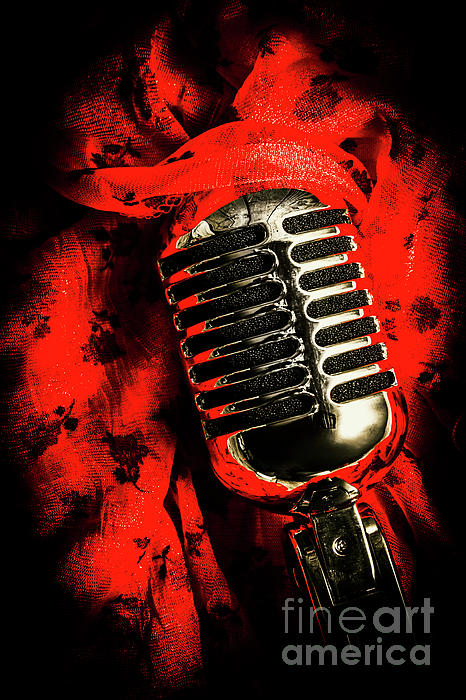 Evening night show portraiture with a retro silver microphone on red fabric. Classic evening cabaret