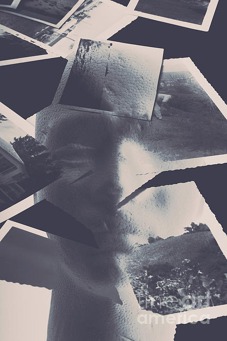 Fine artwork abstract on a face reflecting on photos of vintage experiences from human conciousness. Complex conundrum in self awareness
