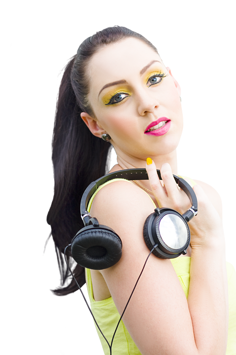 Isolated Studio Portrait Of A Sexy DJ Girl Carrying A Set Of Stereo Earphones Or Headphones On Shoulder In An Audio Electronics Technology And Sound Concept