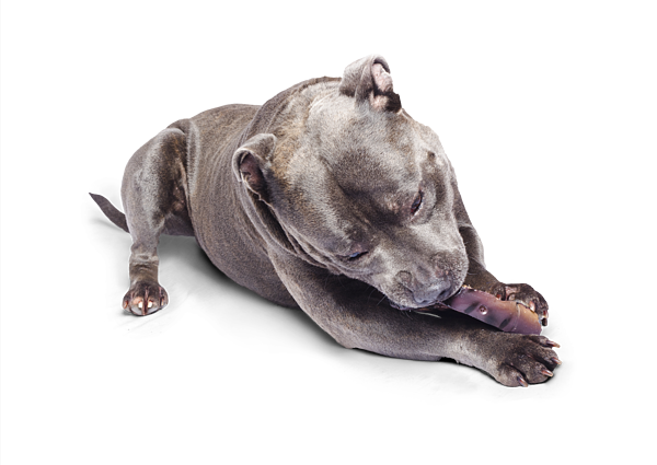 Closeup of pet dog eating a chew toy, white background