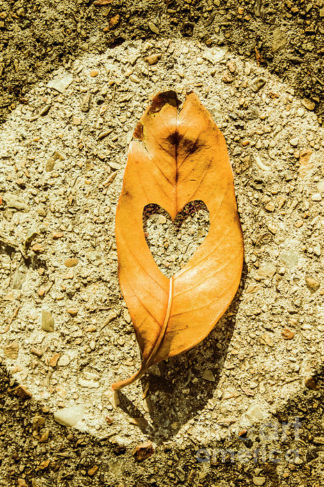Fallen leaf framed on a cement circle with heart shape cutout. In autumns romance