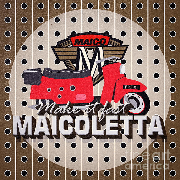 Old-fashioned tin sign design on a pop art illustrated German moped in retro detail. Maicoletta Scooter Advertising