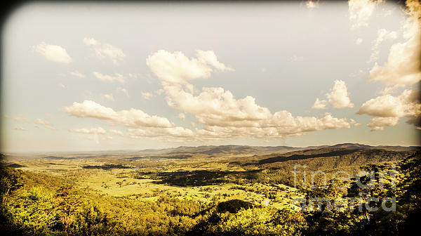 Old fashioned film style landscape of a stunning Queensland rural view, taken from Mount Mee of the Moreton Bay and Glass House Mountain region in Australia