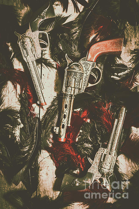 Battle of a childhood memory in a game of cowboys and Indians. Toy cap guns and feathers