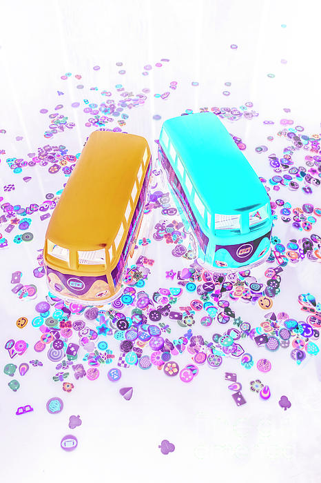 Pop art stylised scene on psychedelic vans driving on summer stickers from vacations past. Stuck on 1970