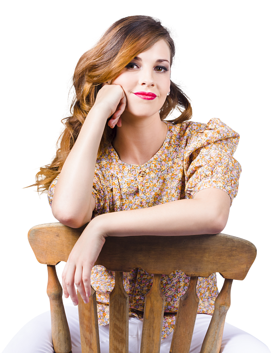 Attractive smiling young woman at rest on antique wooden chair, studio background.
