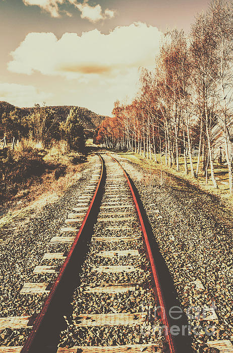 Rustic railway scene on autumn tracks leading through Tasmanian country. New Norfolk, Tasmania, Australia