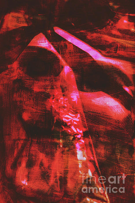 Sinister photo art on a haunting face obscured by red curdling secrets untold. They are pure evil